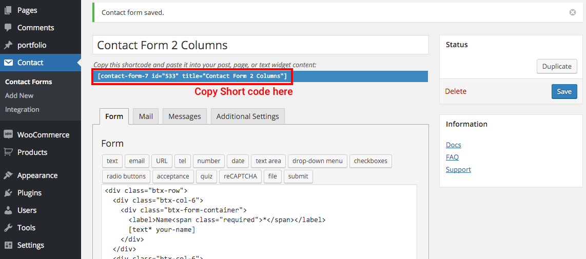Click Save, and there will be contact form shortcode appears. You can copy contact form shortcode to use in Contact Form element in Blueprint or anywhere supported shortcode, ex. Text in Blueprint, post or text widget.