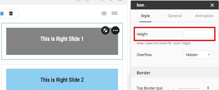 leave box's height blank, otherwise slide's height would be distorted. parallax background of box won't be able to apply with half slide page, set parallax speed to 0 to prevent some display errors.