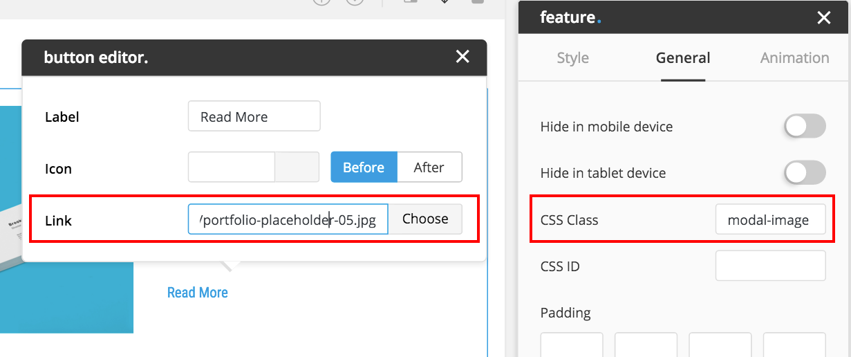 2. Modal Trigger : can be in any form, image/icon/text/button. Modal Box will popup after click the Trigger. To create the trigger, simply add link name as "#modal-{modal's name}" into the link input field.